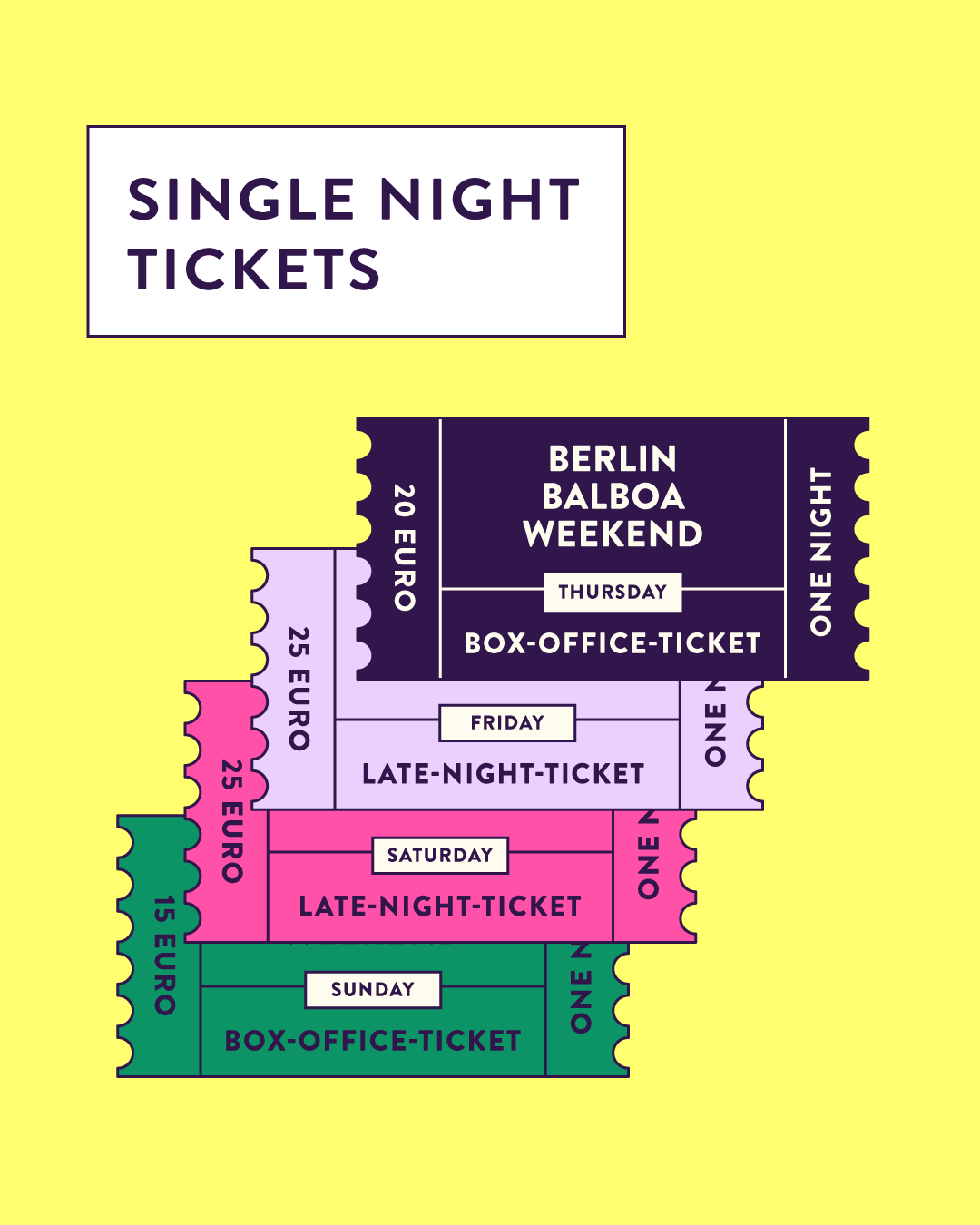We will be selling normal tickets at the door on Thursday and Sunday, and we will most likely have very limited late night tickets at the door on Friday and Saturday night around 12:30 AM, depending on how busy the dancefloor is.